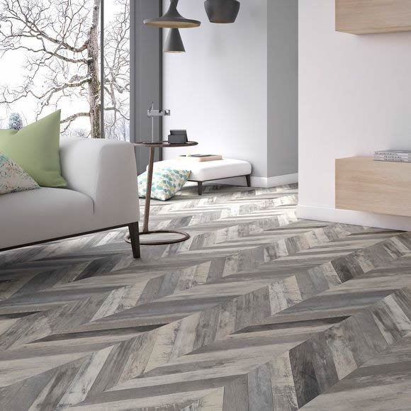 The Faus Masterpiece Chevron Vintage flooring is a rustic grey oak, wood effect laminate, with natural dark and light tones in a chevron design. the floooring is the perfect choice for high moisture areas, such as bathrooms and kitchens, due to the water proof surfaces and hydro proof edges. The wide boards offer a great textured surface, along with a life time domestic warranty.